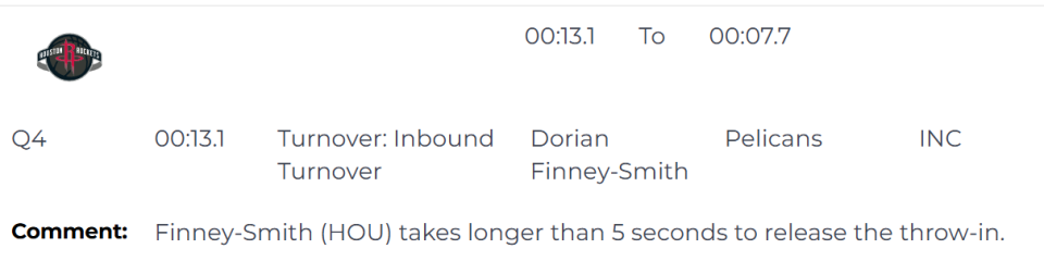 唯一的漏判发生在第四节最后13秒,芬尼-史密斯发边线球5秒违例,但裁判没有吹罚。这个球发出后,杜兰特完成了制胜一击,中距离跳投命中。考虑到杜兰特进球前火箭是落后的一方,裁判若吹了5秒违例,鹈鹕将获得球权,并有1分领先优势,他们显然是更有可能拿下胜利。显然,火箭占了一个大便宜。